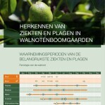 Brochure van het Herkennen van ziekten en plagen in walnotenboomgaarden met duidelijke foto's van waarnemingen en de perioden.